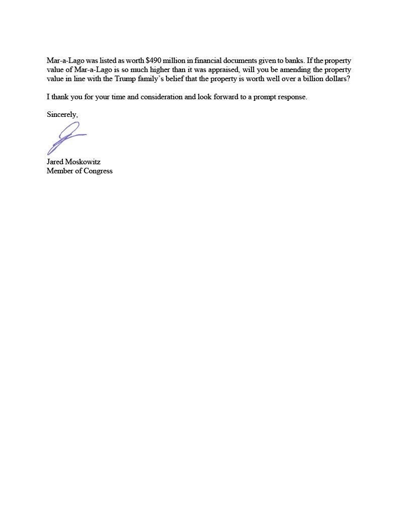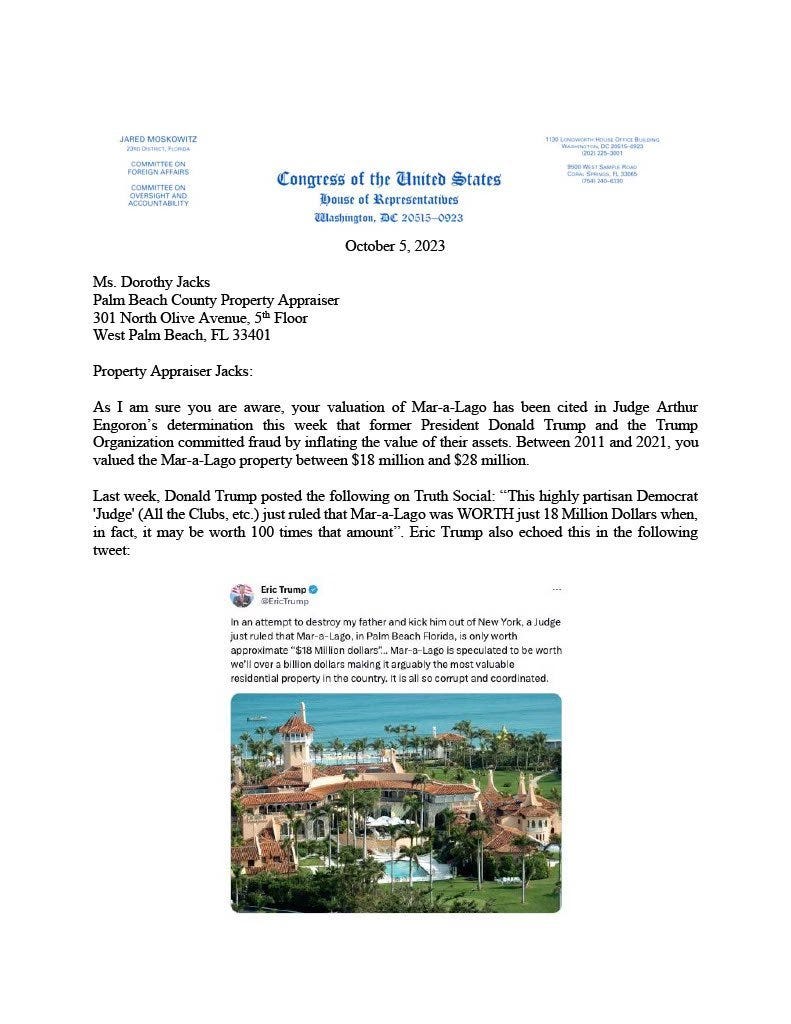 A footnote here: Trump claimed Mar-a-Lago was undervalued by the Palm Beach County property appraiser, who set its taxable value at $18,000,000, a number that has surfaced in the fraud case. Trump claims it’s actually worth $1,000,000,000. Jared Moskowitz, who represents Palm Beach in the House of Representatives, wrote a letter to the county appraiser, requesting that Trump pay taxes on his self-described “real” value of the property.