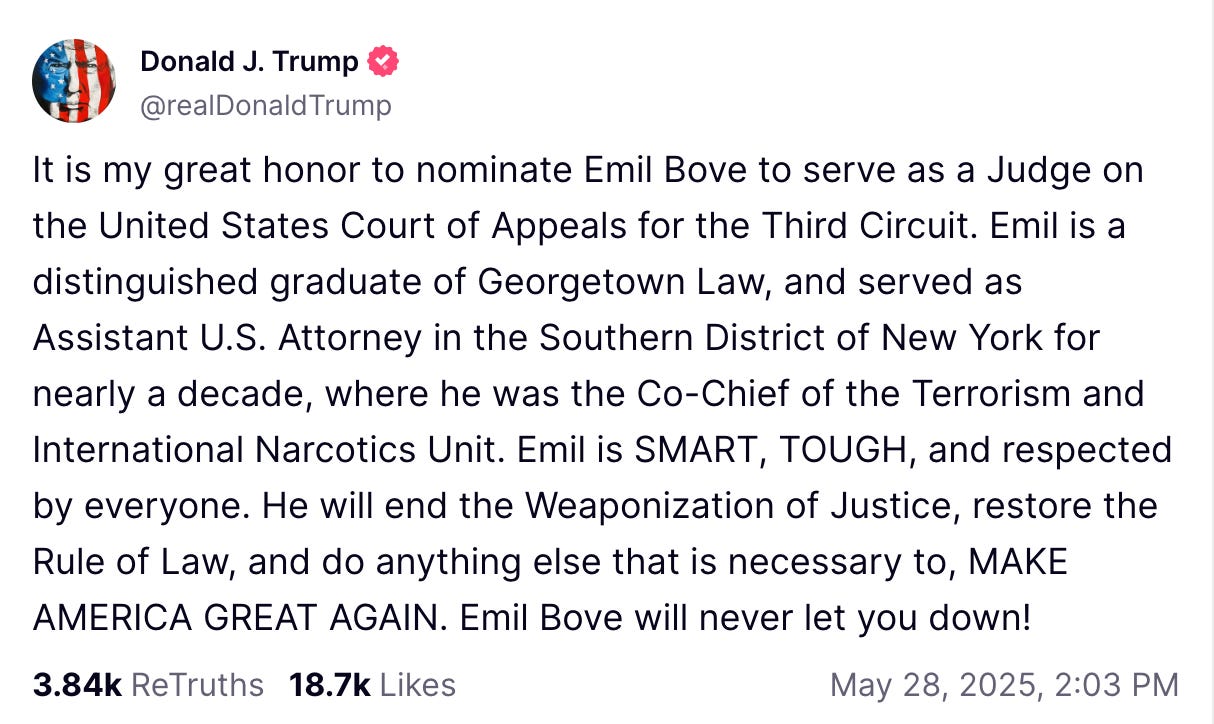 Presidents have appointed close friends to the bench, like Woodrow Wilson did with Louis Brandeis. But something unprecedented happens tomorrow when the Senate Judiciary Committee takes up the confirmation process for Donald Trump’s criminal defense lawyer, Emil Bove, to become a judge on the Third Circuit Court of Appeals, which covers Pennsylvania, New Jersey, Delaware, and the Virgin Islands.