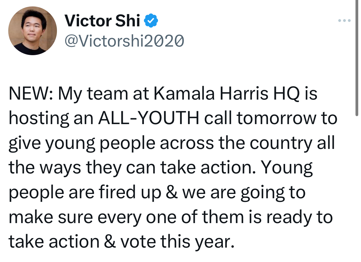 Victor Shi, who was nice enough to join us for “Five Questions” last April, just before he joined the Youth Team on the Biden campaign, took to Twitter to announce an “ALL YOUTH call” that will happen tomorrow, Thursday, July 25.
