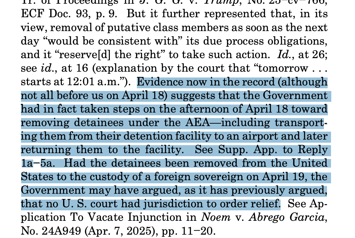 There are a couple of threads to pull there. First, the Supreme Court didn’t tell the government what it would have to do before deporting people in order to satisfy due process requirements. Second, they emphasized that they are granting the injunction because if they didn’t, the government would deport these people and then claim, as they have in the Abrego Garcia case, that once someone is out of the United States, even when our government is responsible for that, the courts no longer have jurisdiction to hear their cases. That’s as close as the Supreme Court ever comes to accusing the government of perfidy.