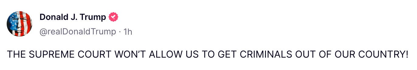 Friday afternoon, the Supreme Court ruled 7-2 In one of the many immigration cases currently in the courts as a result of Trump’s deportation of alleged Tren de Aragua gang members without any due process. In A.A.R.P. v. Trump, the Court enjoined the government from summarily deporting alleged gang members under the Alien Enemies Act while litigation over the constitutionality of those deportations works its way through the courts.
