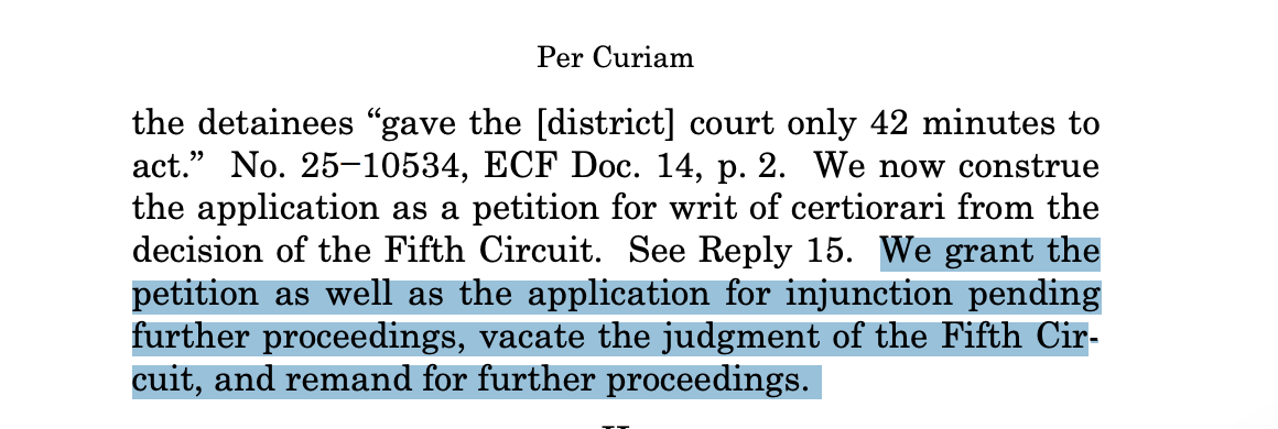 To ensure that the Fifth Circuit gets the message, the Court offered some caveats, concluding that “The detainees’ interests at stake are accordingly particularly weighty” because the government didn’t refute the plaintiffs claim it was previously prepared to whisk them out of the country quickly and with no chance to go to court while also arguing in another case that “it is unable to provide for the return of an individual deported in error to a prison in El Salvador.” The Court directs the Fifth Circuit that “Under these circumstances, notice roughly 24 hours before removal, devoid of information about how to exercise due process rights to contest that removal, surely does not pass muster.” Now it’s up to the Fifth Circuit to set the bar the government must clear to provide due process, knowing it will be subject to review by the Court again after they do and that seven of the justices are testy about it. If they read the opinion, they’ll find a lot of guidance in it.