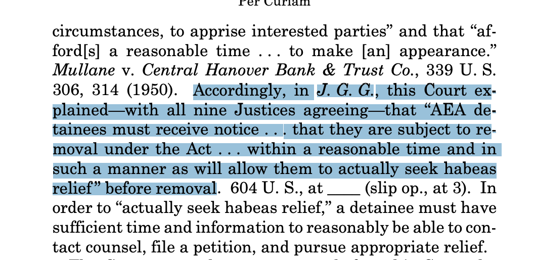 The Court underscored the fact that previously, all nine of the Justices unanimously agreed that aliens are entitled to due process. That came in the in the course of considering the government’s efforts to deport these people faster than the courts could intervene. The Court made it as clear as one has to when talking to a four-year-old, that “In order to ‘actually seek habeas relief,’ a detainee must have sufficient time and information to reasonably be able to contact counsel, file a petition, and pursue appropriate relief.” The government can’t deport people unless they have that opportunity. End of story.