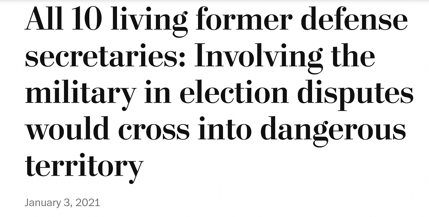 They referred to senior defense leaders who they quoted as weighing in to say, “‘there’s no role for the U.S. military in determining the outcome of a U.S. election.’ Efforts to involve the U.S. armed forces in resolving election disputes would take us into dangerous, unlawful and unconstitutional territory.” They admonished Chris Miller, the acting secretary who had assumed his post most unusually after Trump lost the election in 2020, with his chief of staff, Kash Patel, at his side that “They must also refrain from any political actions that undermine the results of the election or hinder the success of the new team.” Just days later, the two were in place as rioters overran the Capitol.