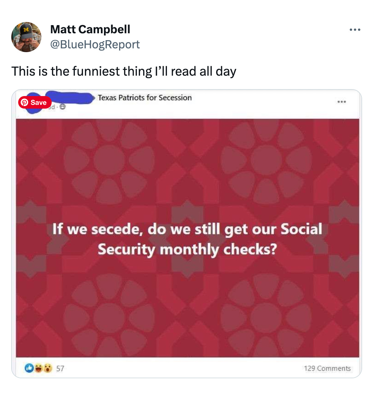 Kudos to @BlueHogReport catching this post from “Texas Patriots for Secession” earlier in the week: