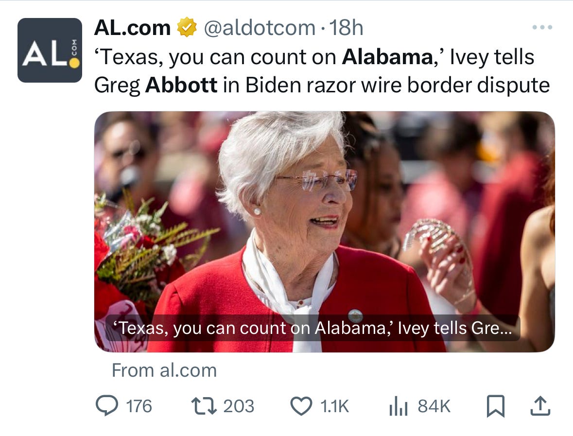 What's going on in Texas? The current immigration challenge by Governor Abbott is over Texas’s installation of razor wire along a 29-mile stretch of the border, preventing federal border and immigration agents from access to the border near Eagle Pass, Texas, including sites federal agents launch their patrol boats from. Bear with me on the legal quagmire that followed.