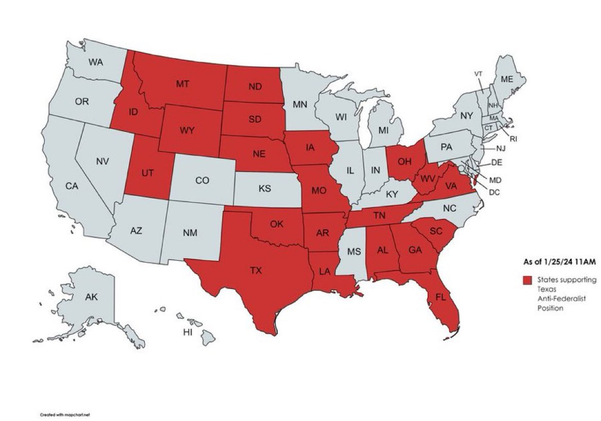 In the meantime, though, while Republicans refuse to move ahead with the prospect of new legislation, Texas has stepped into the breach. Texas wants to take over the border from the federal government and implement its own policies, even when they lead to migrants dying as they attempt to cross the border. And as of late last week, approximately twenty-five other (red) states, had indicated support for some or all of what Texas was doing, even those nowhere close to the border.