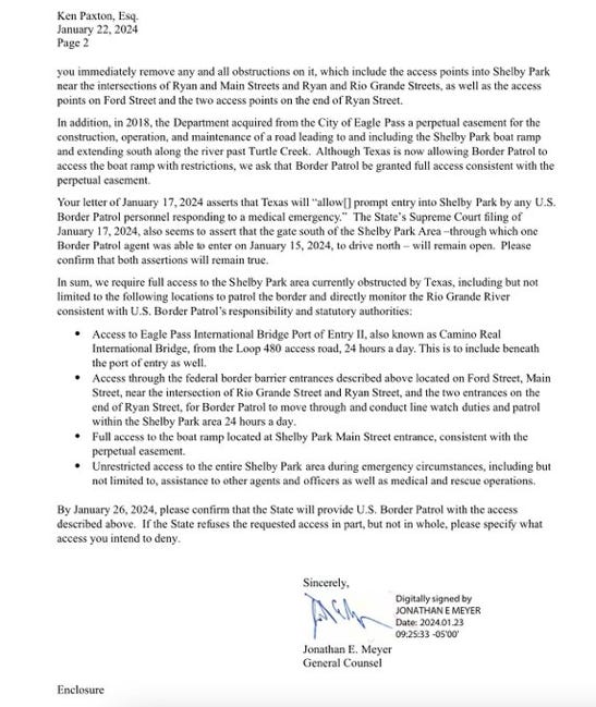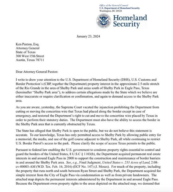 The Department of Homeland Security had to write to Texas to demand border access. In their letter, they wrote that Texas had been denying them access since Governor Abbott seized Eagle Pass city land on January 10.
