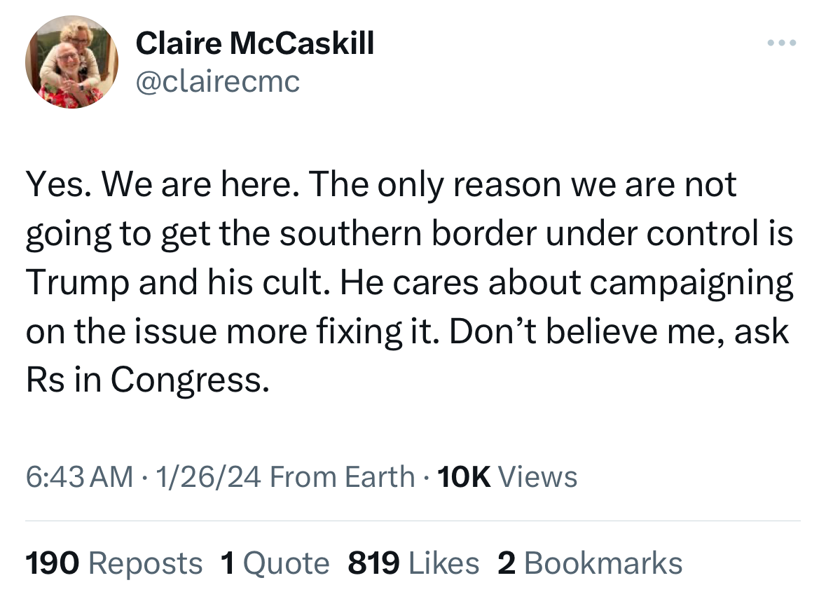 Mehdi Hasan tweeted, “The Republicans want you to believe there is a literal invasion at our southern border, but also that it doesn’t need to be repelled or stopped … till January 2025.” Former Democratic Senator Claire McCaskill weighed in too: