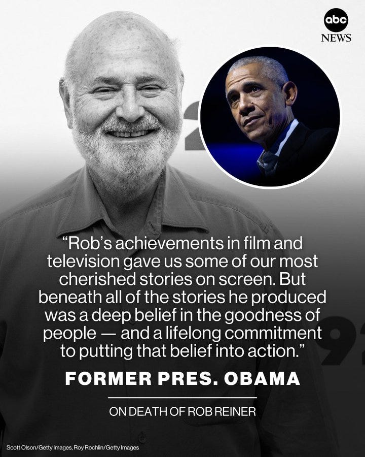 I don't know why the death/murder of Rob Reiner and his wife hit me so hard today, but it did. I couldn't give a rip what T said, because he's only ever trying to make the talk be about him. Even bad PR is free PR for him. But I am absolutely gutted by the loss of this wonderful, creative, inspirational human being. I just gave up and had a good cry today. Because that's what grief does. Tomorrow we'll get back to work. And here in the Pacific Northwest, we have a lot of cleanup to do, and it is still raining. Thanks for posting Obama's response, though. Let the goodness of our human hearts prevail.