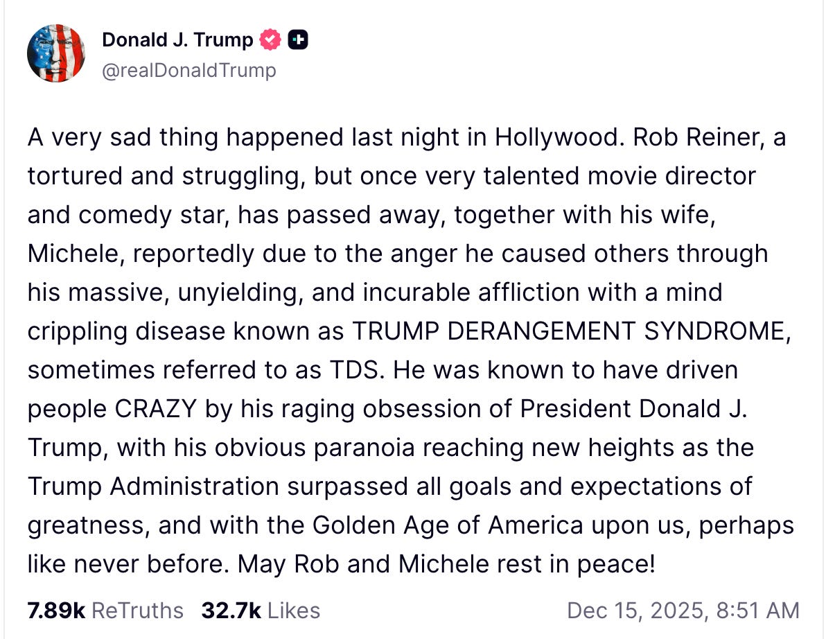 But not Trump, who doubled down on his social media post during a medal presentation this afternoon: “I wasn’t a fan of his at all. He was a deranged person as far as Trump is concerned…The Russia hoax, he was one of the people behind it. I think he hurt himself career-wise. He became, like, a deranged person. Trump derangement syndrome. So I was not a fan of Rob Reiner at all in any way, shape or form. I thought he was very bad for our country.”