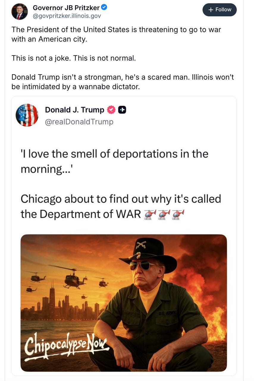 “I love the smell of deportations in the morning,” Trump posted on Truth Social Saturday morning, an off-base reference to the famous line in the Vietnam film Apocalypse Now, “I love the smell of Napalm in the morning.” “Chicago about to find out why it’s called the DEPARTMENT OF WAR, followed by three helicopters. Illinois Governor JB Pritzker was quick to point out “This is not a joke. This is not normal.”