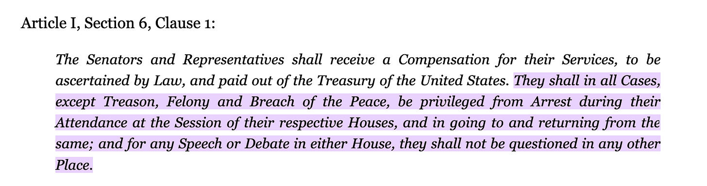 Members of Congress have immunity for conduct they engage in on the floor of their chamber as well as when they are engaging in committee work, including investigations. And that protection can extend much further, as we learned when South Carolina Senator Lindsey Graham tried to avoid testifying pursuant to a grand jury subpoena in the Fulton County investigation. When that matter reached the Supreme Court, the Court held that the trial court correctly “assumed that the informal investigative factfinding that Senator Graham assertedly engaged in constitutes legislative activity protected by the Speech or Debate Clause” and that “Senator Graham may not be questioned about such activities.” The Courts agreed that for anything that allegedly was outside of the scope of Graham’s senatorial duties, for instance, communications with the Trump campaign, he could go to the court for further consideration of how far the privilege reached.