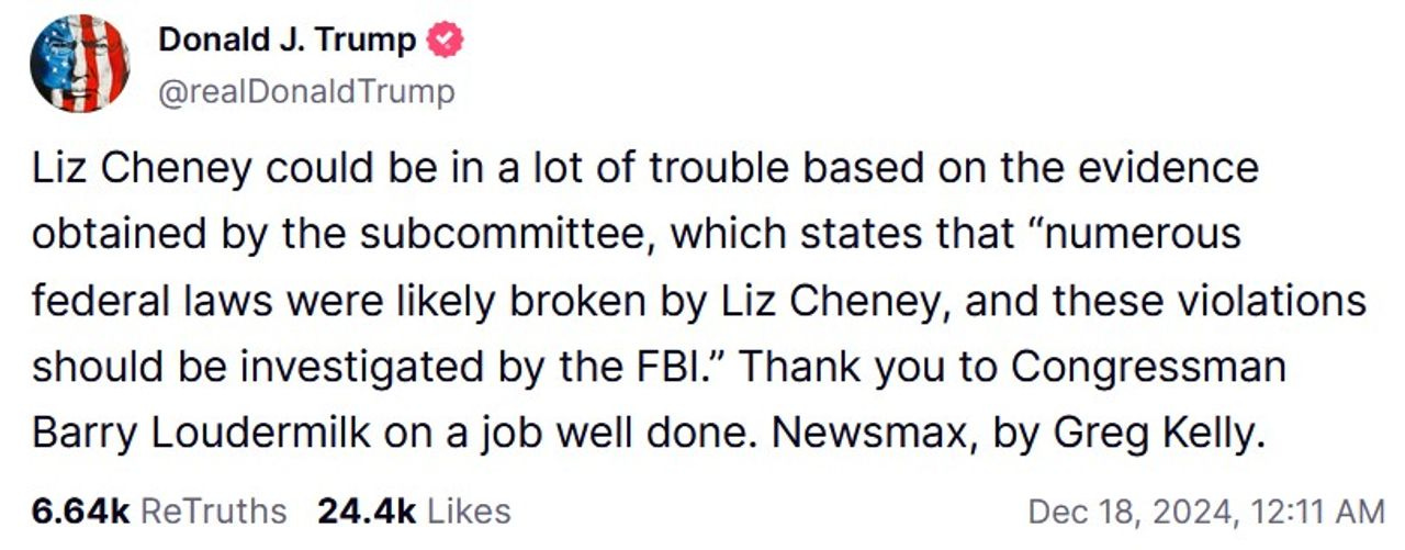 Predictably, Trump weighed in on Truth Social. "Liz Cheney could be in a lot of trouble based on the evidence obtained by the subcommittee, which states that 'numerous federal laws were likely broken by Liz Cheney, and these violations should be investigated by the FBI.’"