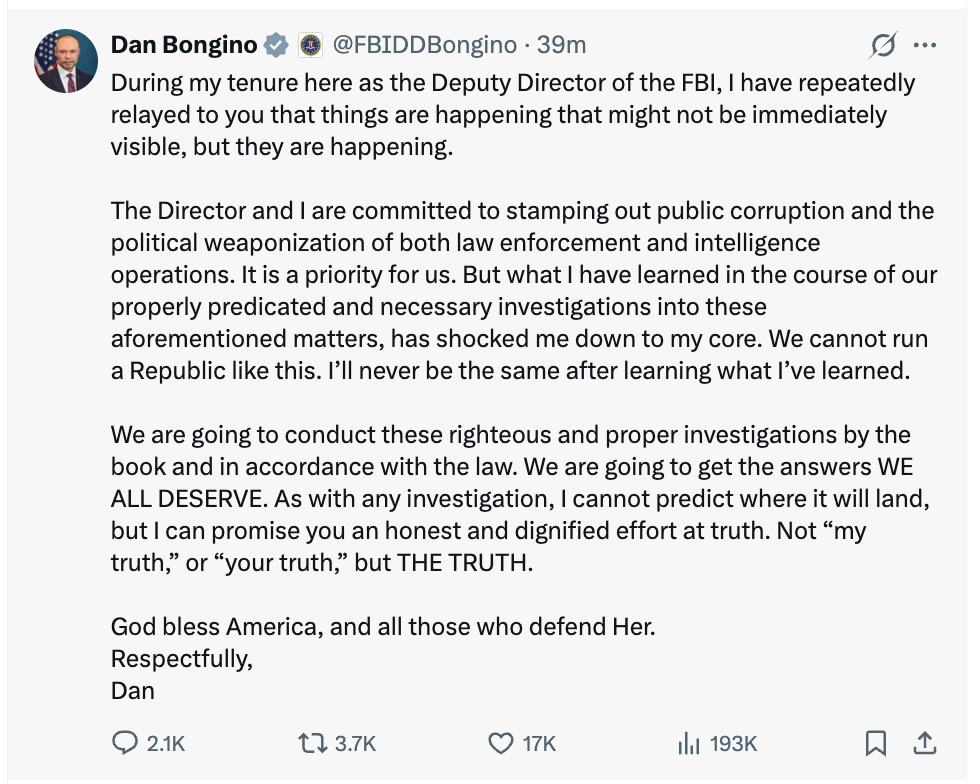This morning, the deputy director of the FBI let loose with a tweet suggesting he knows things you don’t. (This is not surprising. One would hope the deputy director would be a dab hand at keeping secrets.) But it’s the dark brooding vibe here, insinuating that there’s more. So much more. Pick your adventure. Give gas to your favorite conspiracy theory. Dan Bongino just wants to stay on the right side of all of the inflamed MAGA supporters who are pissed off about the Epstein files.