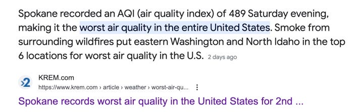 Fires close to Spokane shot up the city’s air quality index to 489 over the weekend. It had dropped back down to 188 by Monday morning. That’s still in a category where “some members of the general public may experience health effects; members of sensitive groups may experience more serious health effects.”