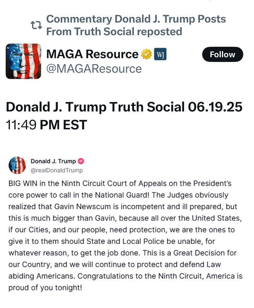 Never one to show restraint, within the hour, Trump took to Truth Social to congratulate the Ninth Circuit. “America is proud of you tonight,” he wrote, which was probably enough to make all three of the judges ill. He called it a “big win” and suggested he’d do it elsewhere, too, a “great decision” that meant he could “continue to protect and defend Law abiding Americans” if state and local police “were unable…to get the job done.”