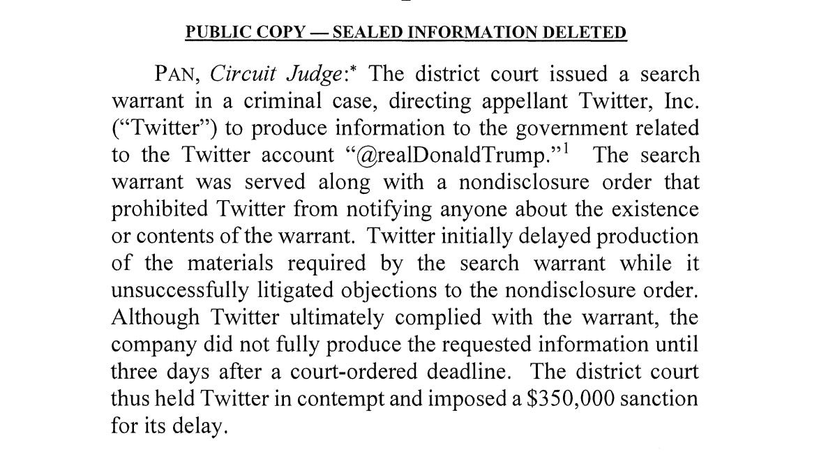 We learned about this today because Twitter declined to comply with the district court’s order. And lost. Ultimately, Twitter failed to comply with the search warrant on time, and the district judge imposed sanctions, ordering Twitter to pay a penalty. Twitter appealed that decision. Today, with the case indicted and no further need for secrecy (or at least not a total blackout—notice that in the version of the order the court released, it suggests that some information has been redacted), we learn that the court of appeals “affirm[ed] the district court in all respects.”