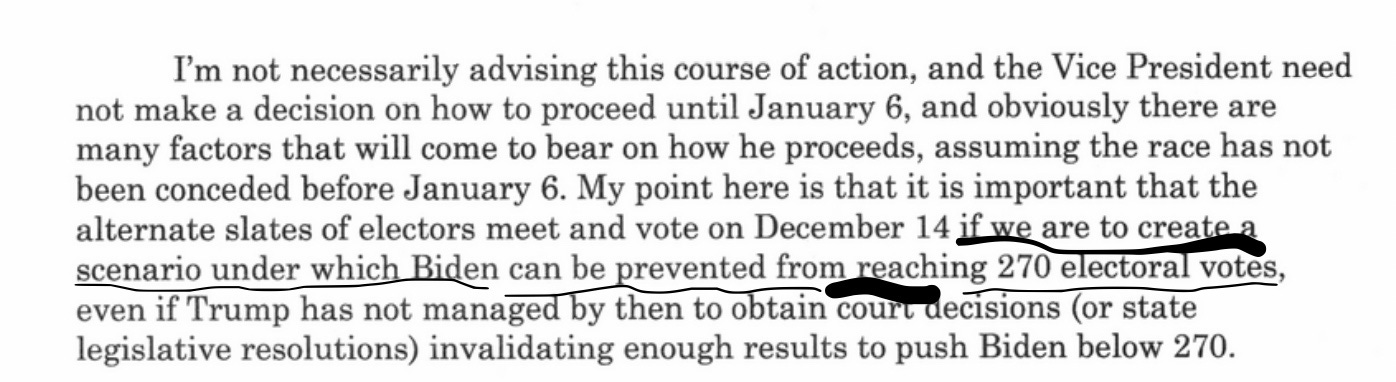 Chesebro concluded that “letting matters play out this way would guarantee that public attention would be riveted on the evidence of electoral abuses by the Democrats, and would also buy the Trump campaign more time to win litigation that would deprive Biden of electoral votes and/or add to Trump's column.” So, just your every day little bit of election subversion, although Chesebro concedes it’s unlikely the Supreme Court would fall for it.