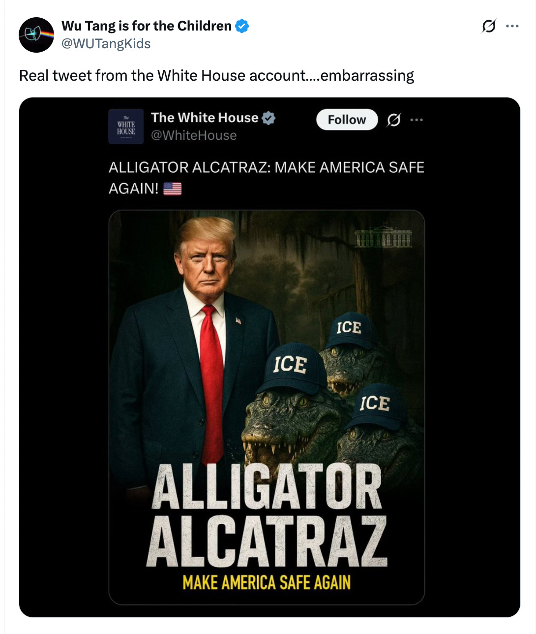 It’s also the small things. Like the official White House account retweeting an absolutely disgusting image, associating Trump with the alligator and swamp-snake guarded prison Florida Governor Ron DeSantis has apparently built to house noncitizens who are being detained by ICE. Perhaps it’s by way of an apology to Trump for having the temerity to attempt a run at him in the primary.
