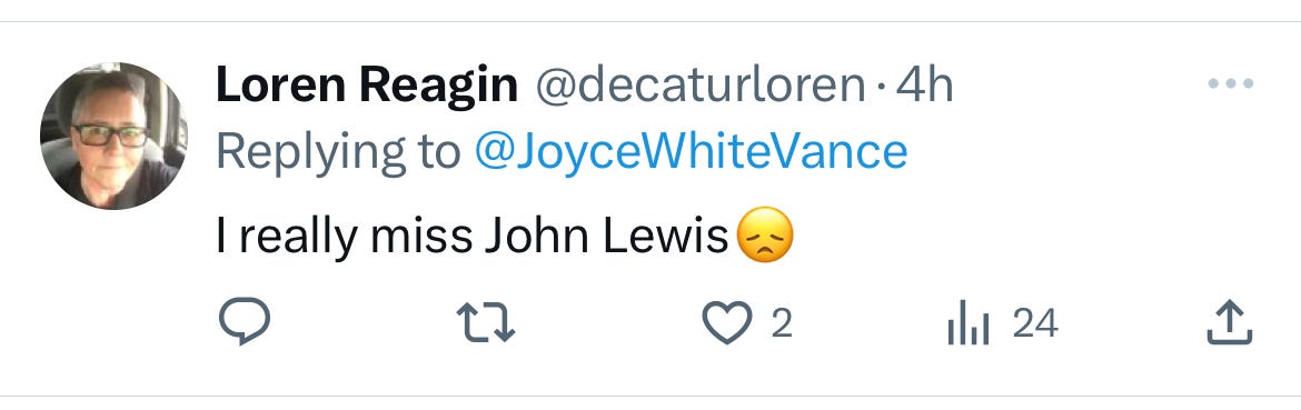 So when I saw this tweet this morning, it tugged at my heart. I really miss John Lewis too. The first time I met him, he enfolded me in a hug after we were introduced. There was something about his love and his certainty and his dedication that convinced you everything was going to work out. Of course, I met him in the early years of the Obama presidency, when there was the promise of change in the air, and we still believed the progress was linear and unstoppable. There was no sense that the Voting Rights Act and other key protections for Americans would be gutted over the next decade. That, in 2023, we would again be fighting for the right to vote. But even as protections for civil rights eroded, listening to Lewis could convince you we could find the wherewithal to do better.