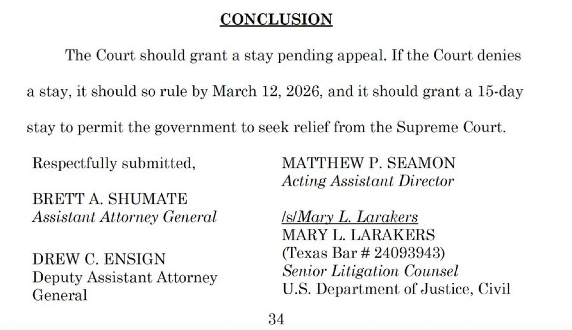 Normally, I’d expect to see a case like this handed by the Justice Department Civil Division’s appellate section. Instead, we have the Associate Attorney General, the number three official in the Department—he supervises the Civil Division—on the brief, along with one of his deputies. No word on whether they decided to take the case over or whether the experienced career lawyers in the Civil Division declined to participate. Both the earlier brief abandoning the appeal and Friday’s brief were signed by Abhishek S. Kambli, one of the Deputy Associate Attorney Generals. According to his Federalist Society biography, prior to his appointment at DOJ, Kambli was the Deputy Attorney General at the Kansas Attorney General’s Office, but he also has experience as both a federal prosecutor and a JAG officer. In other words, this is someone who understands the fight he is picking with the federal judiciary.