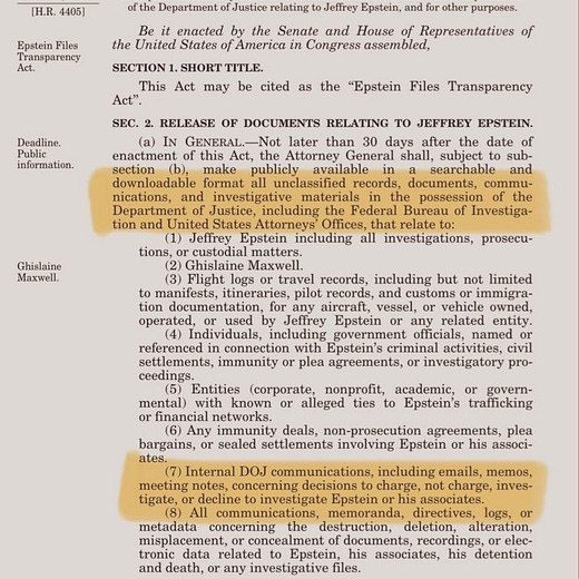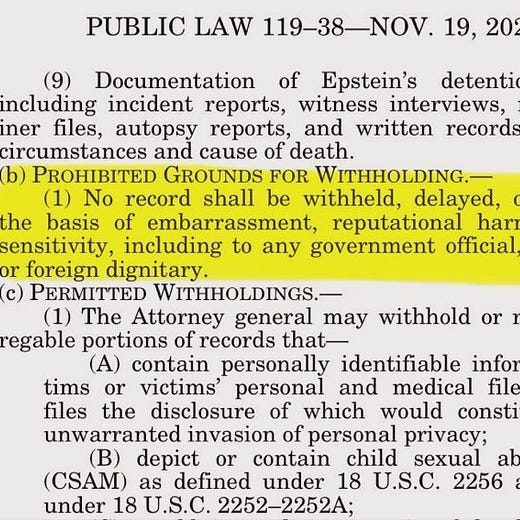 Add to that the fact that the redactions appear to be protecting people involved with Epstein, potentially including individuals who were involved in criminal conduct or in aiding and abetting it. As Republican Representative Thomas Massie points out, that’s a still more serious violation of the Act.