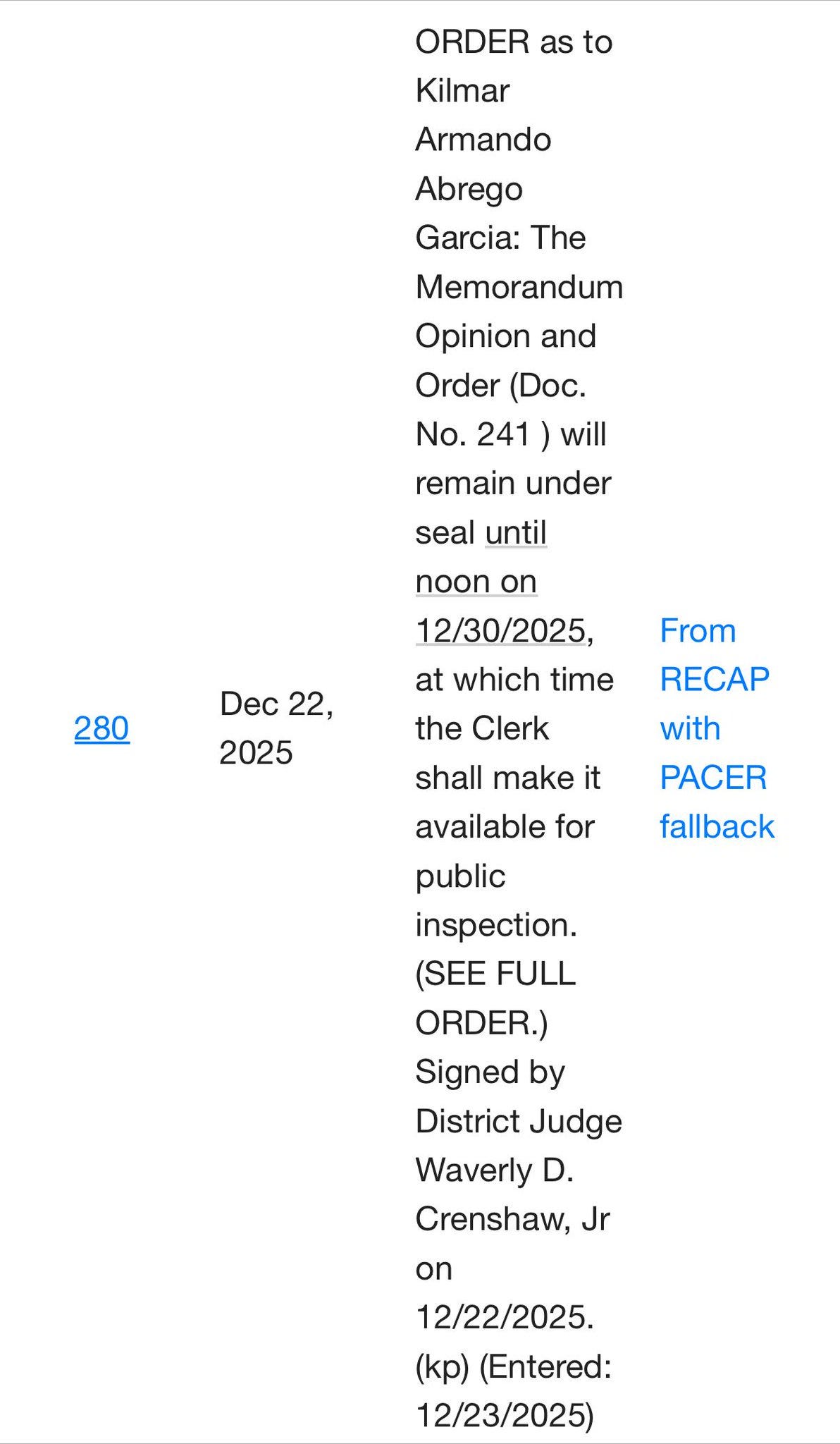 On December 23, the judge presiding over the criminal case against Kilmar Abrego Garcia issued a ruling under seal. It’s scheduled to become public on December 30. The ruling came from federal District Judge Waverly D. Crenshaw, Jr. in the Middle District of Tennessee. Judge Crenshaw is overseeing the government’s criminal case against Abrego Garcia, which we discussed here (and also the fact that the longtime criminal chief in the U.S. Attorney’s office resigned when it was indicted, here).