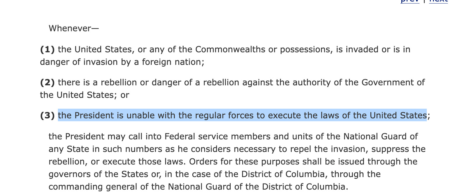 But before you get too excited about that, this is still the same Supreme Court. And as I’ve repeatedly suggested, these cases were a logical place for them to draw a line in the sand, because Trump has been arguing the courts have no ability to review his decisions about when federalizing and deploying the Guard was appropriate. In other words, ruling in Trump’s favor here would make the courts irrelevant. The Court wasn’t ready to let Trump go quite that far, at least for now. They get there, however, in an interesting fashion, writing that “We need not and do not address the reviewability of findings made by the President under §12406(3) or any other statute,” because of an interesting legal argument that they apply.