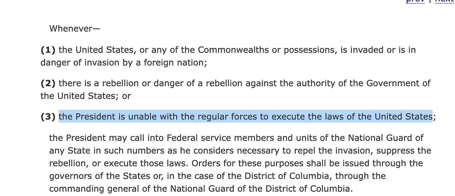 “This interpretation means that to call the Guard into active federal service under §12406(3), the President must be ‘unable’ with the regular military ‘to execute the laws of the United States.’ Because the statute requires an assessment of the military’s ability to execute the laws, it likely applies only where the military could legally execute the laws. Such circumstances are exceptional: Under the Posse Comitatus Act, the military is prohibited from ‘execut[ing] the laws’ ‘except in cases and under circumstances expressly authorized by the Constitution or Act of Congress.’ … So before the President can federalize the Guard under §12406(3), he likely must have statutory or constitutional authority to execute the laws with the regular military and must be ‘unable’ with those forces to perform that function.”