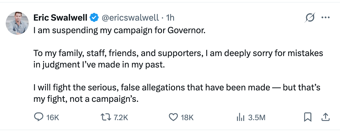 California Congressman Eric Swalwell announced earlier this evening that he is withdrawing from the Governor’s race in that state. In a prepared statement, he wrote: “To my family, staff, friends, and supporters, I am deeply sorry for mistakes in judgment I’ve made in my past." But he continues to deny allegations of sexual assault. He said he’d continue to fight to clear his name, but “that’s my fight, not a campaign’s.” A former staffer told the San Francisco Chronicle that Swalwell sexually assaulted her. CNN reported that four women “described sexual misconduct” by Swalwell, including one who alleged he had raped her.