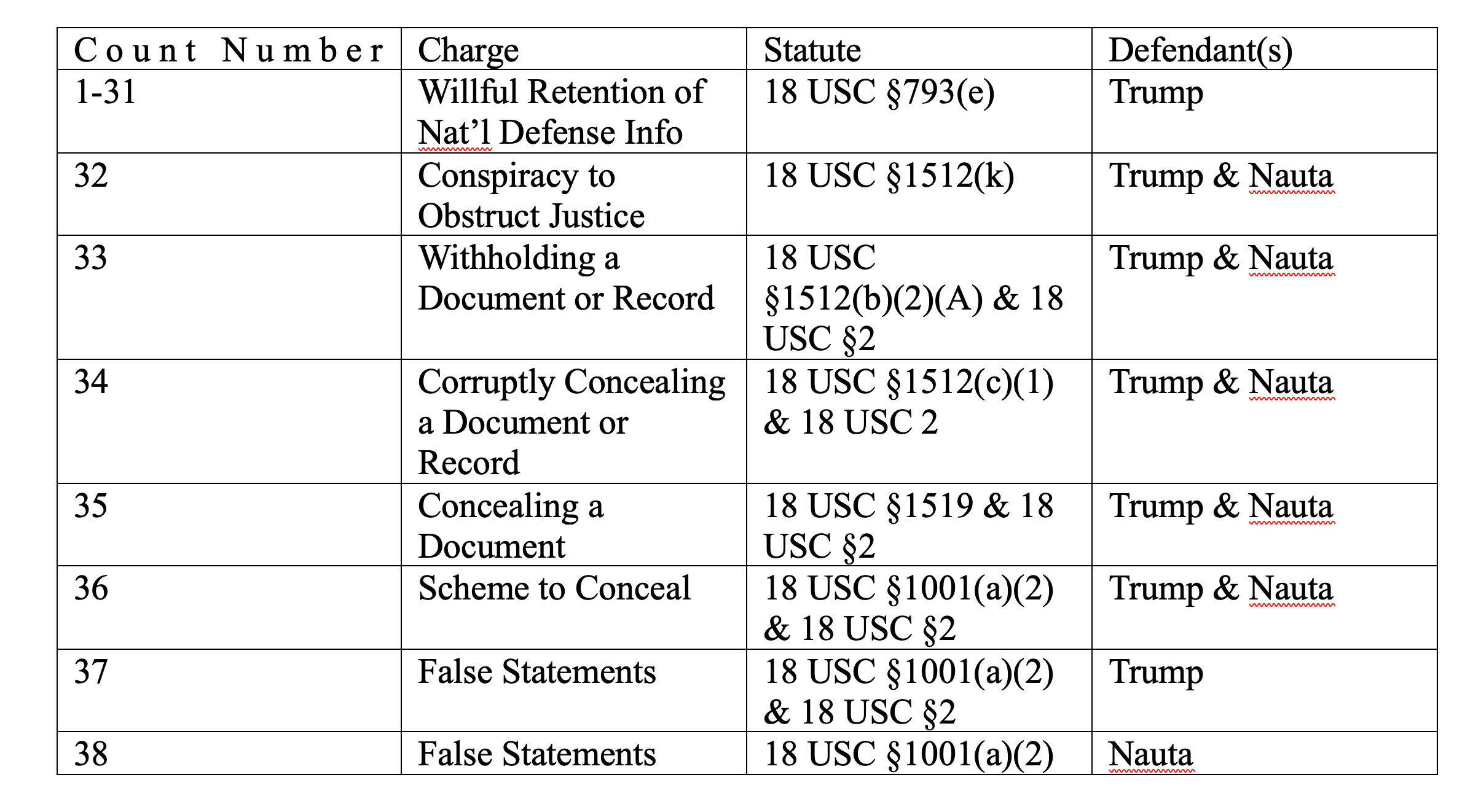 Title 18 U.S.C. § 2, known as “aiding and abetting,” is also included in four of the counts where Trump is charged with Nauta and in the count where he is charged with lying to the FBI. Aiding and abetting is a charge that is included when someone helps another person, “the principal,” commit a crime. The language of the statute gives you a sense of how prosecutors may believe Trump interacted with Nauta to conceal the continued presence of classified materials at Mar-a-Lago: “(a) Whoever commits an offense against the United States or aids, abets, counsels, commands, induces or procures its commission, is punishable as a principal. (b) Whoever willfully causes an act to be done which if directly performed by him or another would be an offense against the United States, is punishable as a principal.” In essence, the statute means that the aider and abetter faces the same sentence as the principal.