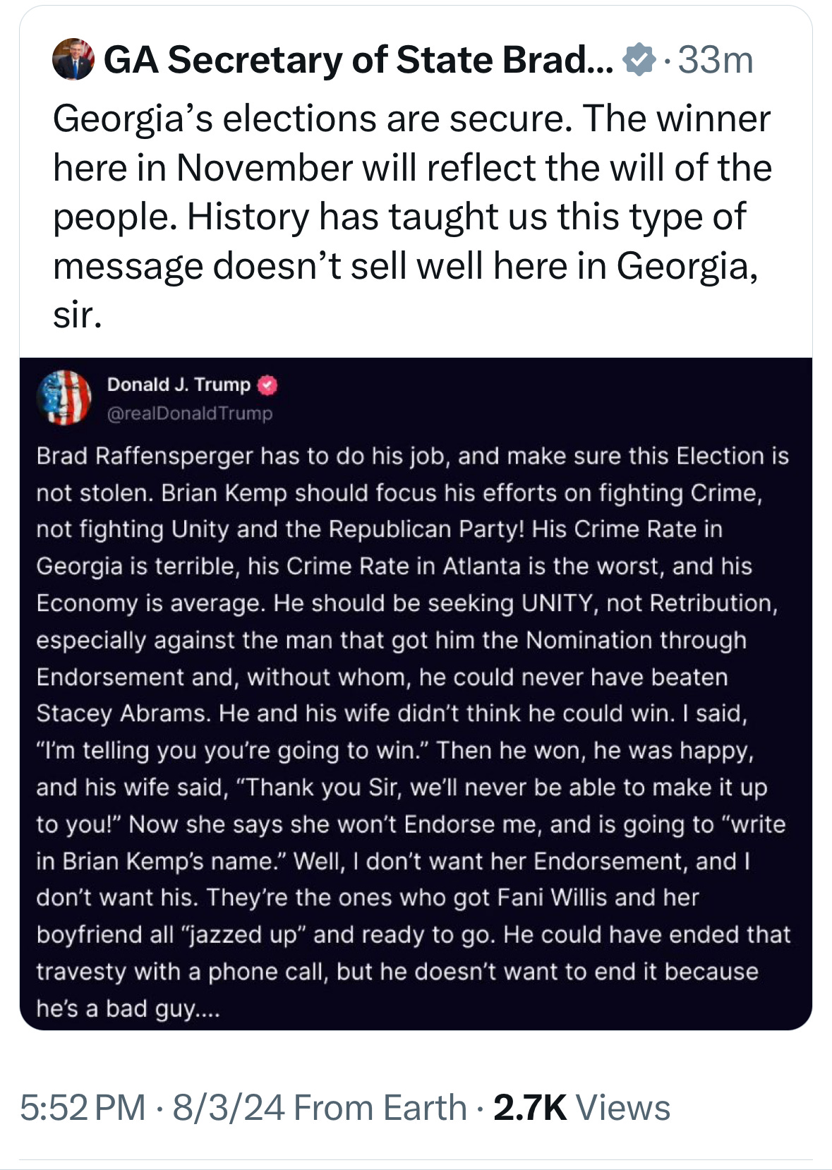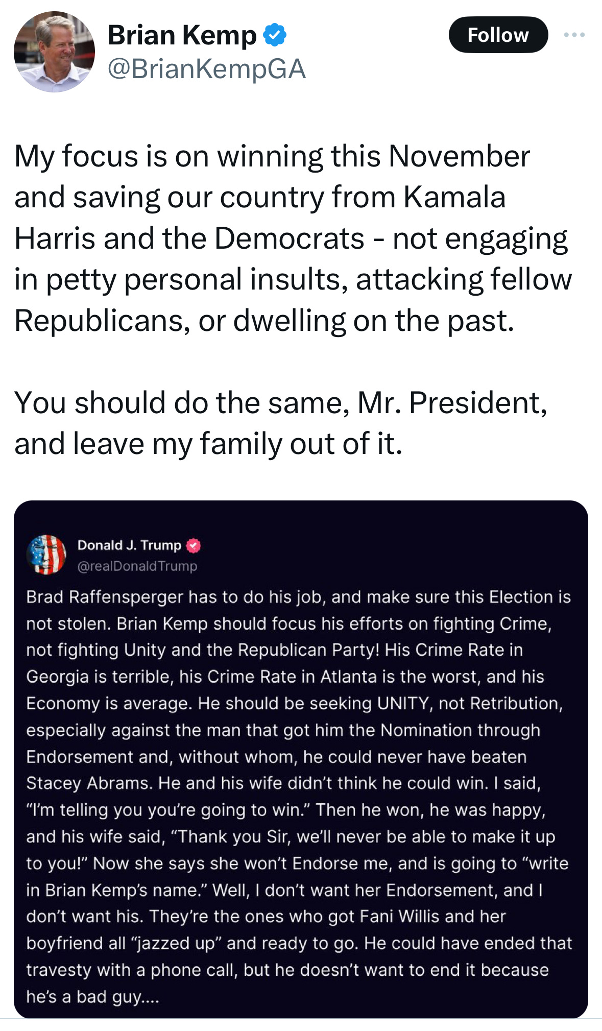 Trump was in Georgia Saturday night, and he set off a little firestorm, talking smack about Georgia’s Republican Secretary of State Brad Raffensperger and Governor Brian Kemp. They both took to social media to respond. We have yet to see the “Republicans in disarray” headlines that would be a prominent feature of the landscape if this sort of infighting was happening among Democrats.