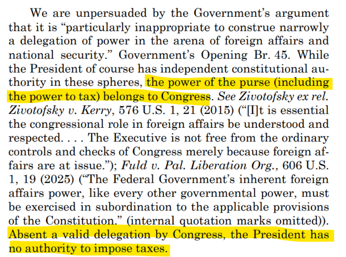 The statute does refer to “regulation” and “importation,” but the court concluded that reading the phrase in which they appear “to include imposing these tariffs is ‘a wafer-thin reed on which to rest such sweeping power.’” No prior president has attempted to use IEEPA to impose tariffs. And the court rejects Trump’s claim that he can use “national security” as a way around the constitutional grant of powers to each of the three branches of government.