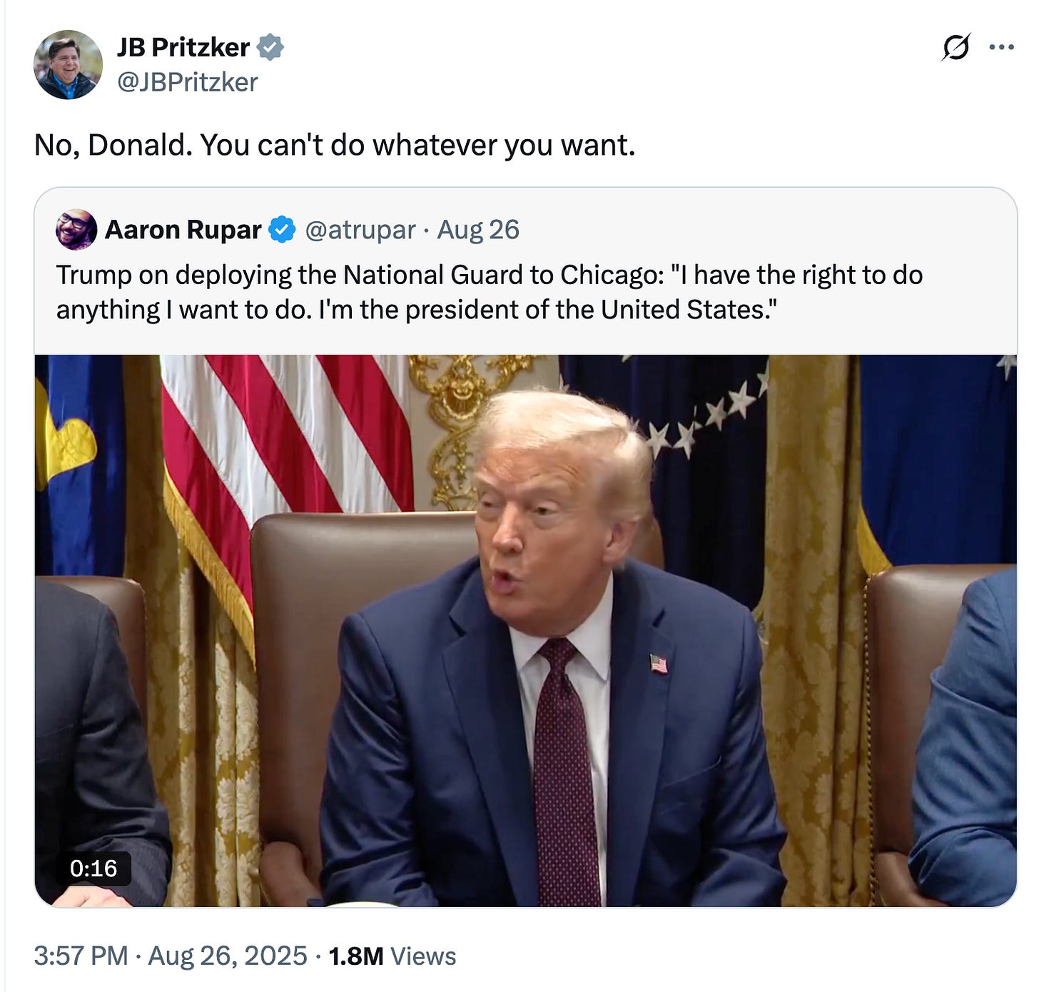 Governor Pritzker pushed back on X: “No, Donald. You can’t do whatever you want.” Last week, the courts agreed, for the most part. This week, we head back to the courts for more.
