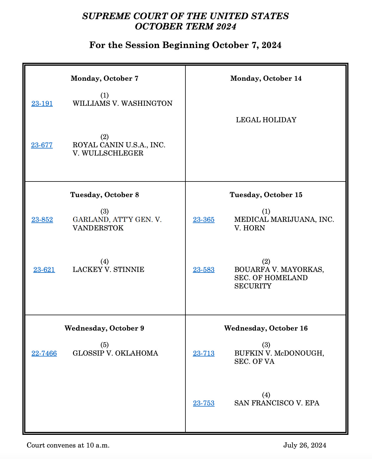 Seemingly aware of that, the Court’s docket has been lighter than usual—they’re saving room. Even with the addition of fifteen cases late last week following the Court’s “long conference,” where it evaluated around 2,000 petitions and other motions, there is still room on the Court’s calendar for what they must know is coming. You can keep up with the cases the Court has set for oral argument each week on their calendar. Here is the schedule for week one.