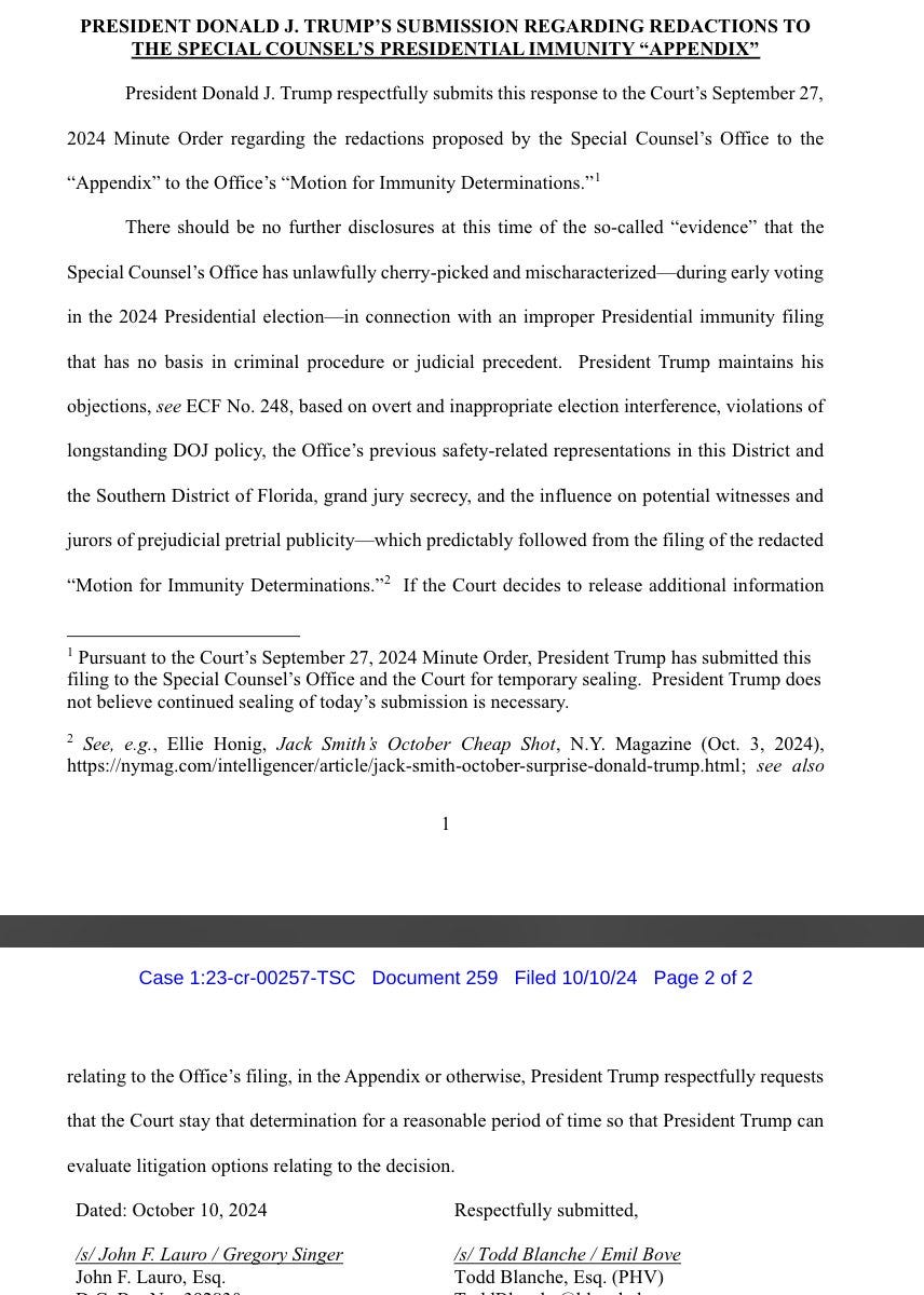 In Trump’s submission, he argued the Special Counsel “unlawfully cherry-picked and mischaracterized evidence” and that he did it “during early voting.”