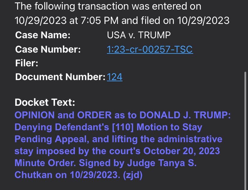 Sunday evening, Judge Chutkan reinstated the gag order in Special Counsel Jack Smith’s election interference case. On October 20, she imposed a temporary administrative stay to give Trump the opportunity to challenge it. Tonight, she denied Donald Trump’s motion and put the gag order back in place.