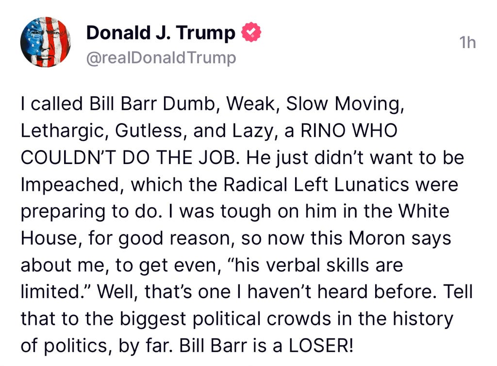 Trump blathered about Mark Meadows, a potential witness against him, while the gag order was stayed. Tonight, after it was entered but possibly before he was aware of it (PACER, the Courts’ online filing system has been glitchy all night), Trump had this to say about his former Attorney General, Bill Barr