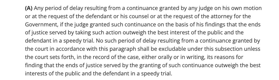 But this type of delay stops the Speedy Trial Act clock from running only if the judge continues the trial because “the ends of justice” require it. Even then, the court is required to set forth its reasons on the record.