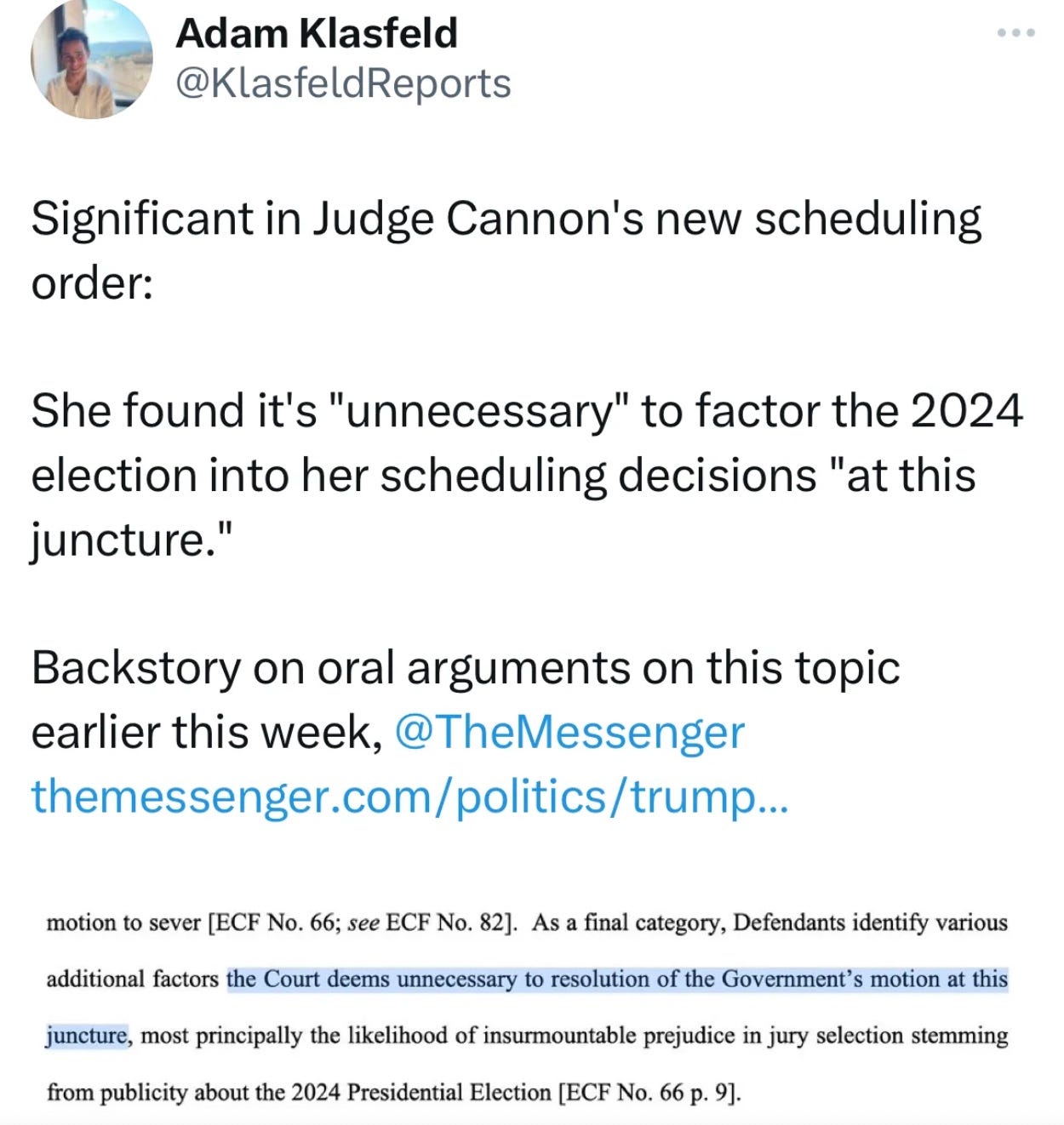 While Judge Cannon may have deemed it unnecessary to consider the 2024 election at “this juncture,” that doesn’t mean she won’t revisit her decision down the road and permit Trump to campaign instead of appear in court. But even mundane delays could derail the speedy trial the Special Counsel has worked so had to obtain here.