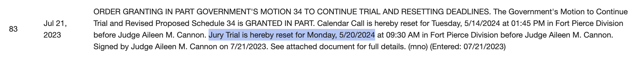 But, it’s far enough out that the prospect of additional delays could easily move the trial date past the election and open up the prospect that Trump would face the voters without having to face the charges against him first. As the trial gets closer, there will be abundant opportunities for Trump’s team to seek delays. They may appeal certain rulings, and they may drag their feet (as they did on filing security clearance papers) on items on the Judge’s pre-trial schedule. There can be illness, or witnesses can become unavailable on certain dates due to unforeseen reasons. And that’s before we even get to the prospect of Trump claiming he must be permitted to attend campaign events. Rulings on whether delay is merited will be in Judge Cannon’s discretion. They are not the sorts of rulings that are readily appealable by prosecutors if the trial date is forced back.