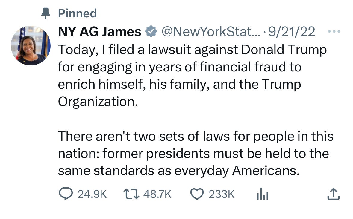But for this week, let’s focus on New York Attorney General Letitia James, whose civil case against the Trumps goes to trial on Monday. Or at least what’s left of it, after New York state Judge Arthur Engoron granted summary judgment in the Attorney General’s favor on fraud charges last Tuesday, leaving several others charges and the issue of damages to be decided at trial.