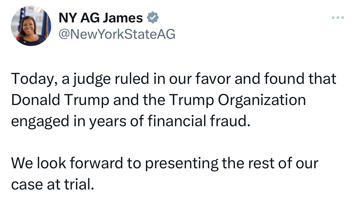 But even before the trial started, James won a major victory. Last week, on Tuesday, Judge Engoron granted summary judgment on her fraud claims. Granting summary judgment means that based on all of the evidence that has been amassed during discovery in the case, including documents and deposition testimony, there are no disputes about material facts for a jury (or in this case, the judge who is sitting as the decision-maker) to decide.