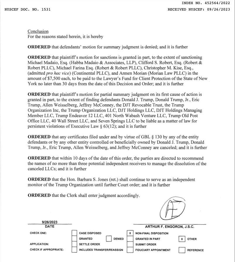 The Judge ruled that as a matter of law, James was entitled to prevail on her fraud claims against the Trumps and Trump Organization. The decision is tantamount to a corporate death penalty, making it impossible for Trump to continue to do business in New York, which is the heart of his operation. Judge Engoron entered the following remedial order:
