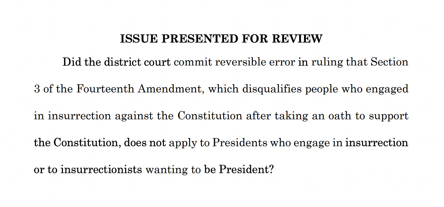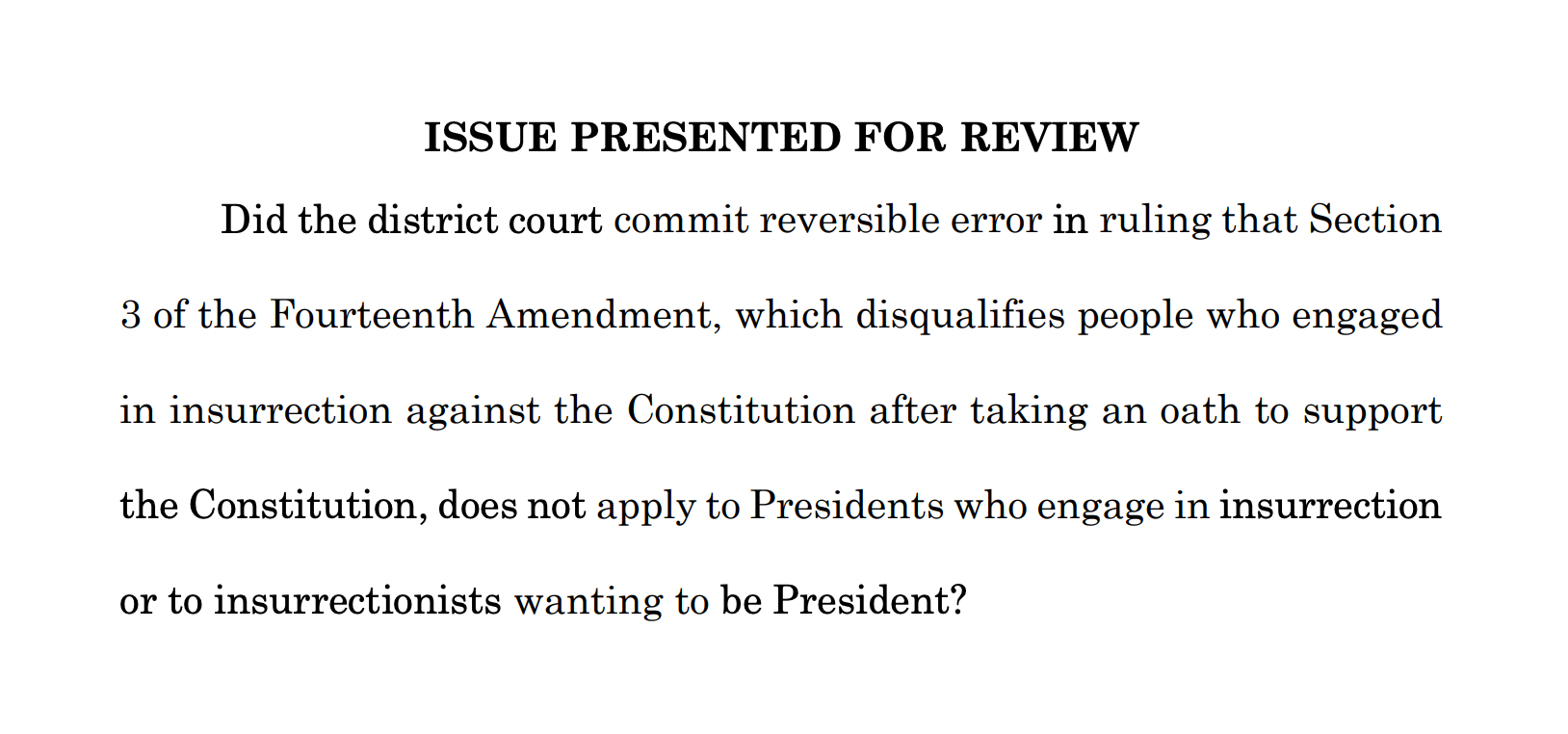 In Colorado, the petitioners seeking to remove Trump from the ballot on 14th Amendment grounds filed an appeal last week with the Colorado Supreme Court. Their 67-page brief came after a surprising ruling from Judge Sarah Wallace found that there was sufficient evidence to believe Trump had participated in an insurrection, but she was not persuaded he was an “officer of the United States” as required for Section 3 to apply to him. The issue the petitioners are asking the Colorado Court to decide has been framed in this rather clever fashion: