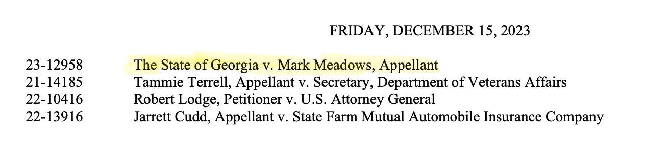 For the appellate geeks among us, we’ll learn who the panel judges will be for Mark Meadows’ Eleventh Circuit appeal—if you can remember that far back—of a federal district judge in Atlanta’s decision refusing to grant Meadows’ motion to remove the Fulton County prosecution from state to federal court. That oral argument is set for Friday the 15th, and the composition of the panel that will hear the case becomes available on Tuesday.