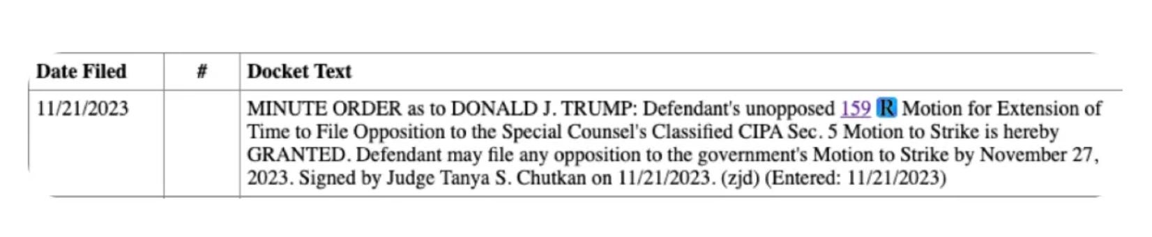 In the Special Counsel’s D.C. case, Trump has a filing due on Monday in his ongoing battle with the government over how classified information should be handled in that case. Classified material isn’t expected to play a major role in this case like it does in the Mar-a-Lago case. Trump had asked for a longer extension for his Black Friday filing deadline, but Judge Chutkan only gave him until Monday.
