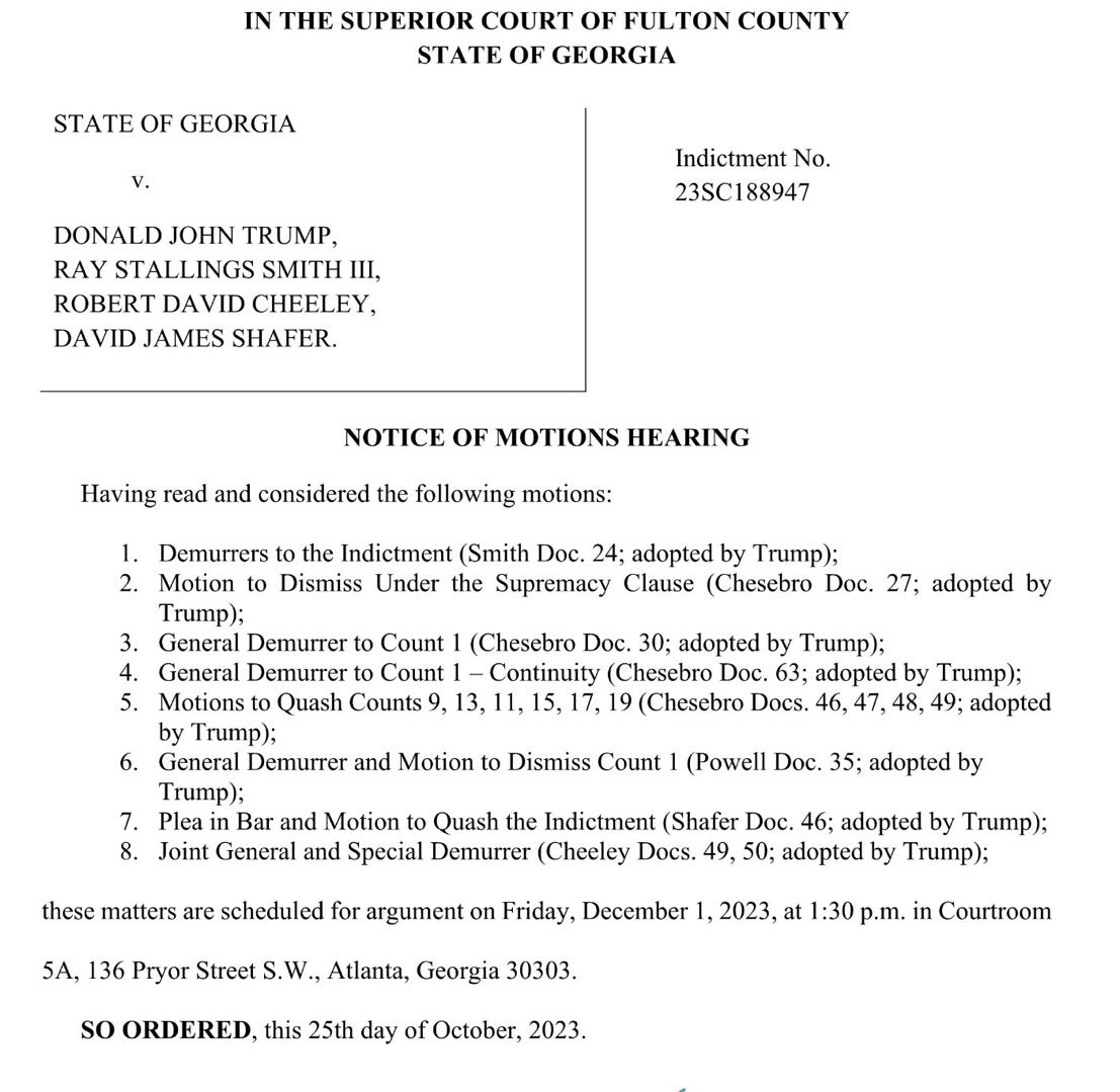 Judge McAfee scheduled the December 1 hearing to take up the many motions by defendant Trump, as well as some of his other remaining co-defendants, seeking to dismiss the charges against them.