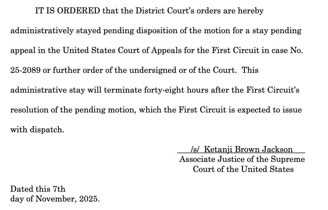 At the Supreme Court, Justice Jackson entered an administrative stay, permitting the administration to hold off at least until the First Circuit rules. She wrote, “Given the First Circuit’s representations, an administrative stay is required to facilitate the First Circuit’s expeditious resolution of the pending stay motion,” giving that court the opportunity to decide the issue before SCOTUS weighs in. Her administrative stay will end 48 hours after the First Circuit rules, which she wrote she expects it to do “with dispatch.”